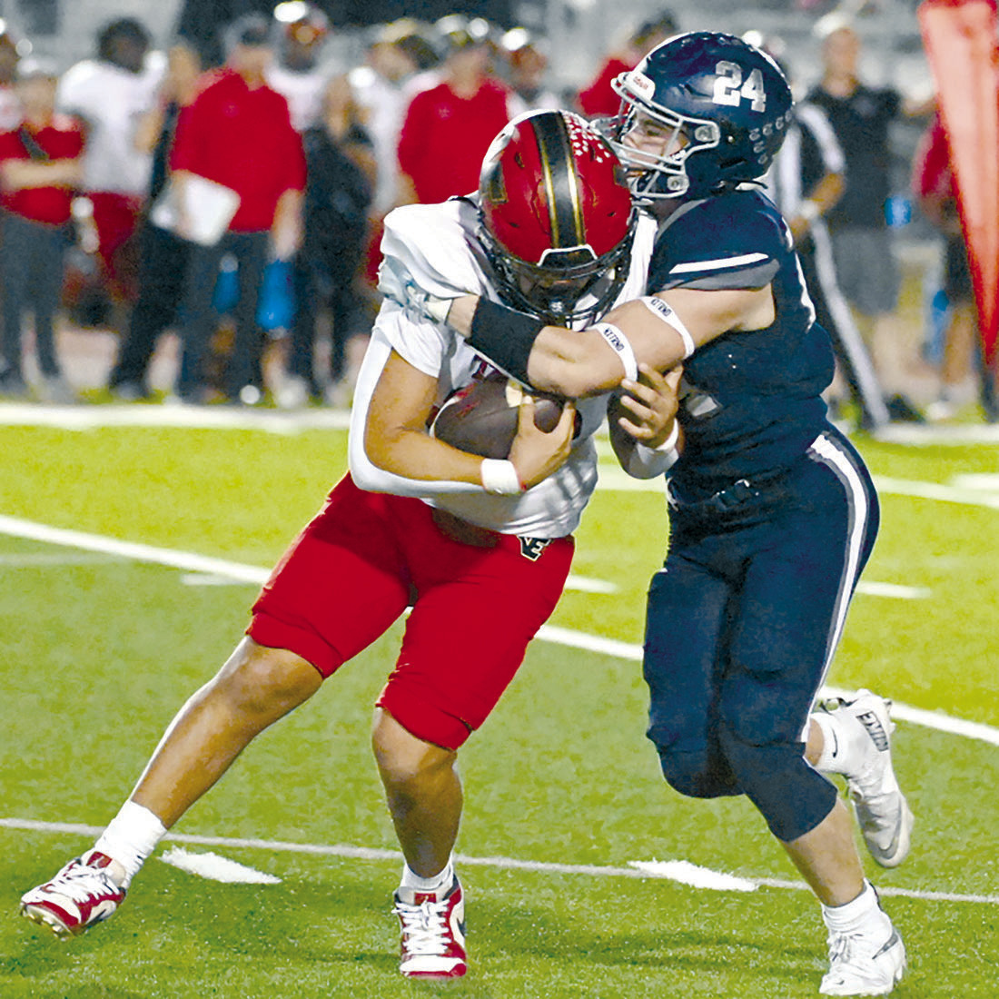 Champion’s Brady Giles (24) stuffs Victoria East quarterback Dedric Callis for no gain during Friday’s homecoming game at Boerne ISD Stadium.