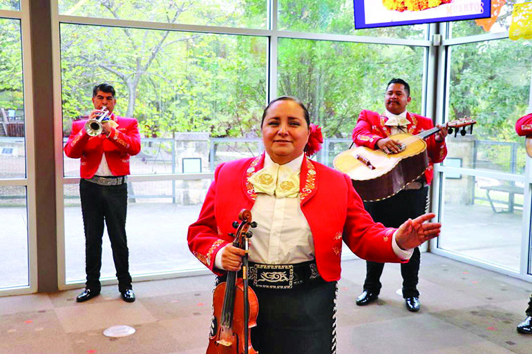 Members of a mariachi band perform for the Dia de los Muertos event attendees at the Patrick Heath Library.