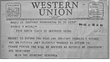 The scrapbook contains the telegrams the family received, including the one informing them Charles McCall had been wounded: “Regret to inform you your son Staff Sergeant Charles E. McCall was slightly wounded in action Twenty Four November (1944) in France. You will be advised as reports of condition are received.”