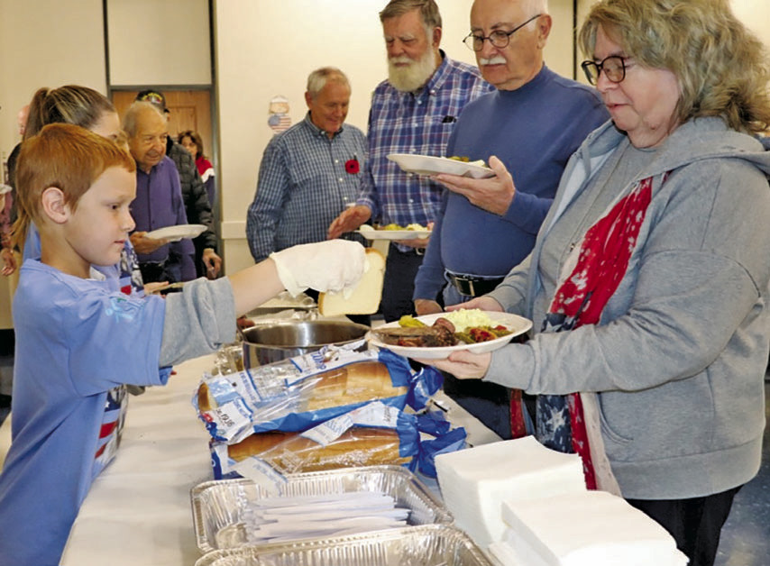 Jake Jureczki places a slice of bread on a plate for Peggy Hoppes, one of the several dozen people who made the trek to St. John Lutheran Church Tuesday, enjoying a free lunch for all military veterans and their families — many of whom had just attended the Veterans Day ceremony at Veterans Plaza. Veterans and family members flow into the St. John Lutheran cafeteria for an after-event meal. Starr photos by Jeff B. Flinn
