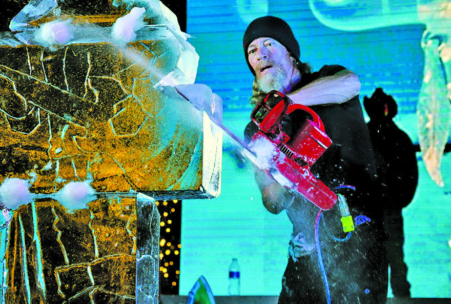 Burr Rasmussen takes a chainsaw to a block of ice Saturday in an ice-carving competition during Dickens On Main.