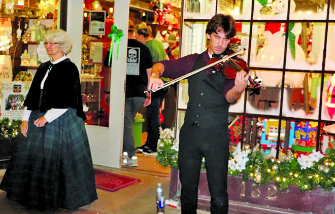 (RIGHT) Aidan Cooper, a Boerne ISD graduate, plays Christmas carols in front of The Christmas Shoppe on Main Street. Star photos by Jeff B. Flinn