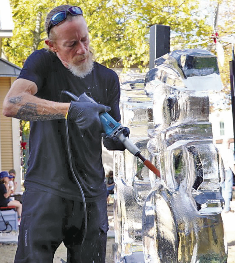 Professional ice carver Burr Rasmussen puts blades, chainsaws and buffers to two blocks of ice, creating a snowman, right, and snow woman in an ice-carving spectacular Saturday along Main Street, sponsored by Shoppes at 222. Star photo by Jeff B. Flinn