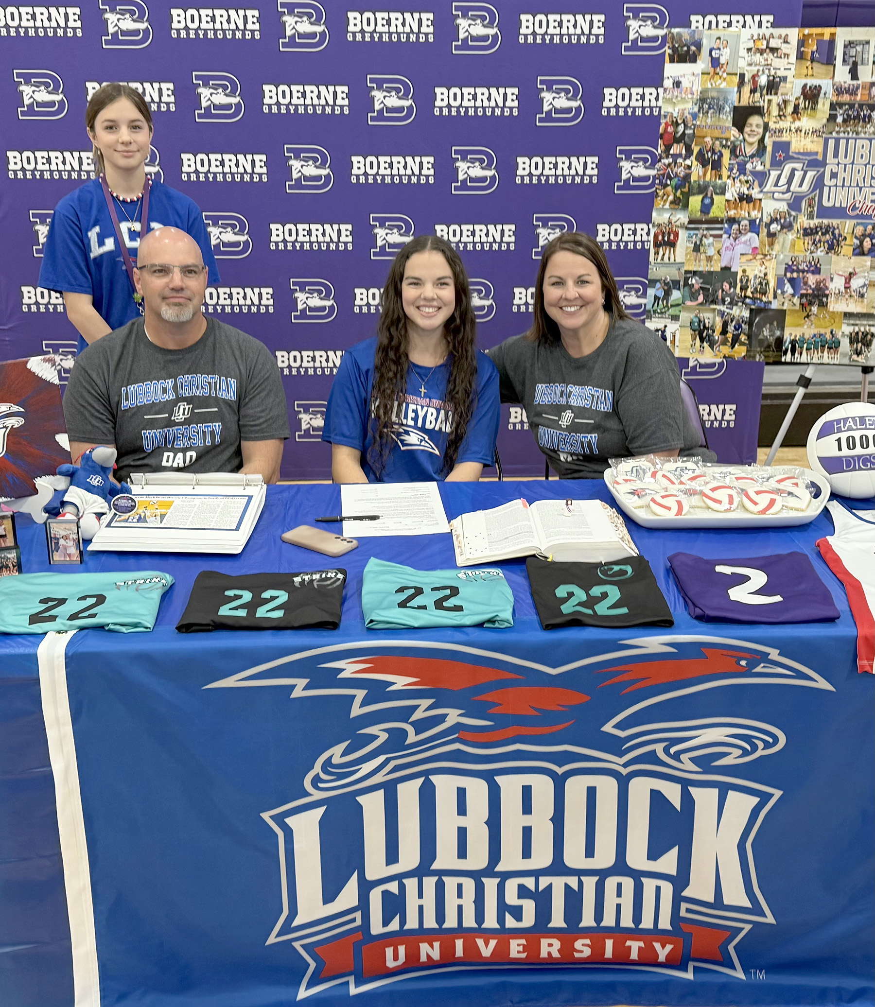 Boerne High’s Haley Wheeler recently signed a national letter of intent to play volleyball at Lubbock Christian University. Haley was joined by family and friends at a ceremony held at Greyhound Gym on national signing day.