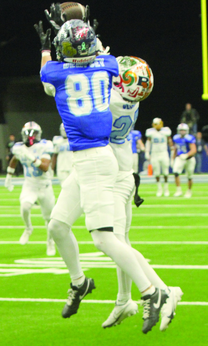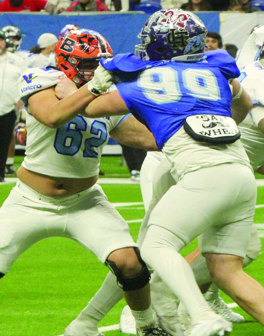 Boerne Champion’s Brogan Dempsey, along with Boerne High’s Eli Nikolas and Blake Burkholder, helped Team Blue defeat Team White last Saturday in the Alamodome, 26-18. Dempsey and Nikolas were wide receivers in the game, and Burkholder played defense and special teams for the Blue squad.