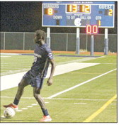 Champion’s Kefe Omokuru controls the ball with a big lead on the scoreboard during Friday’s district match with Wagner. The Chargers added two more goals to kick in the mercy rule. Star photo by Kerry Barboza