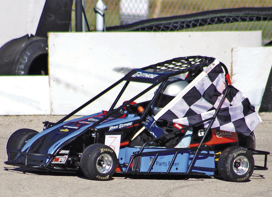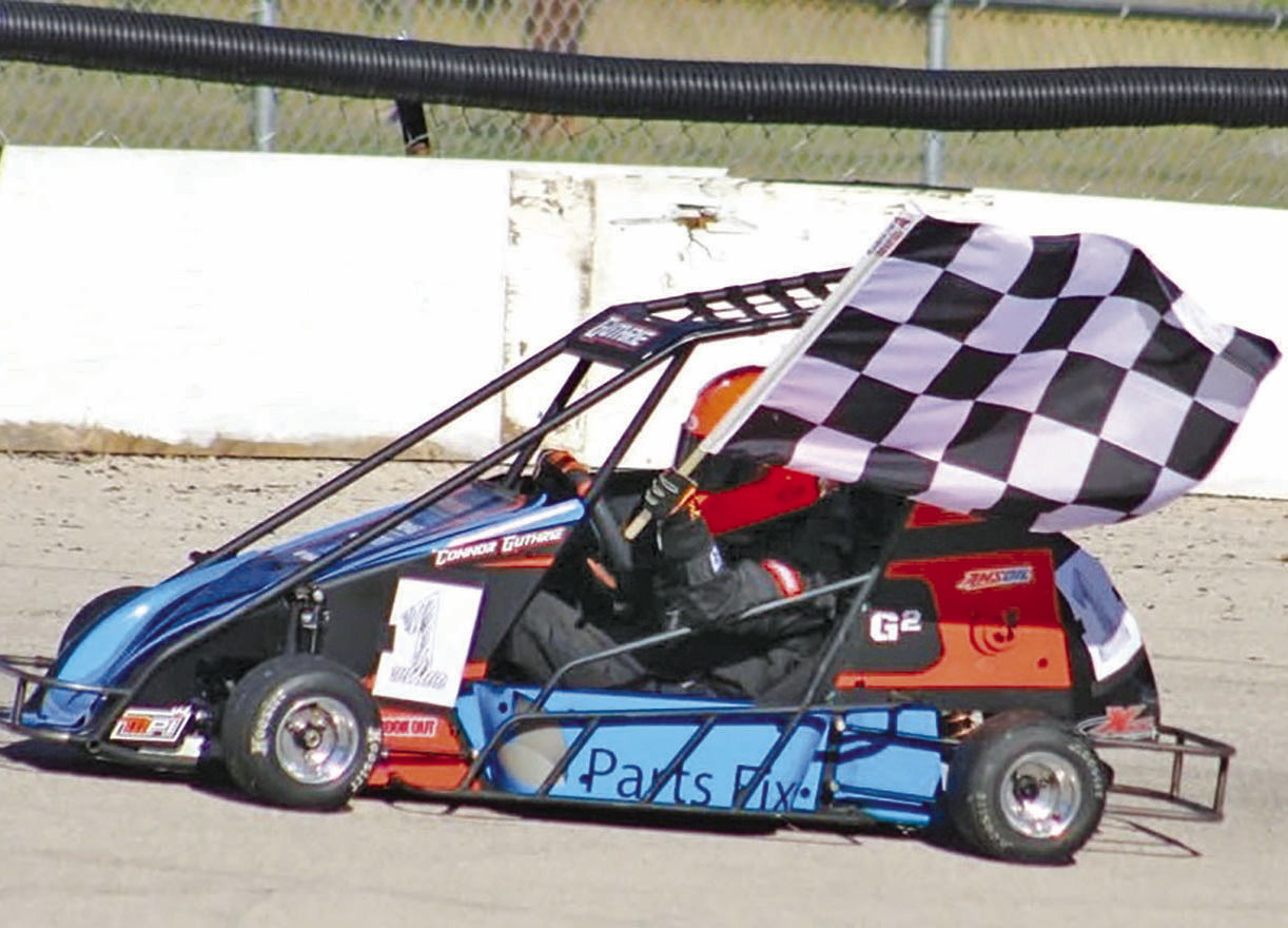 Connor Guthrie 11, left, and Ryan Guthrie, 7, take checkered flags in their quarter midget racers this year.