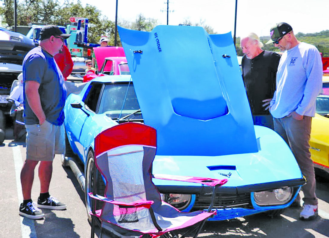 Jason Ferraz, left, and Austin Phillips, right, members of the Classic Street Knights of San Antonio car club, talk to “ Merfie” about the 1973 Corvette he entered in Saturday’s “Cruise For A Cause” car show. Star photo by Jeff B. Flinn