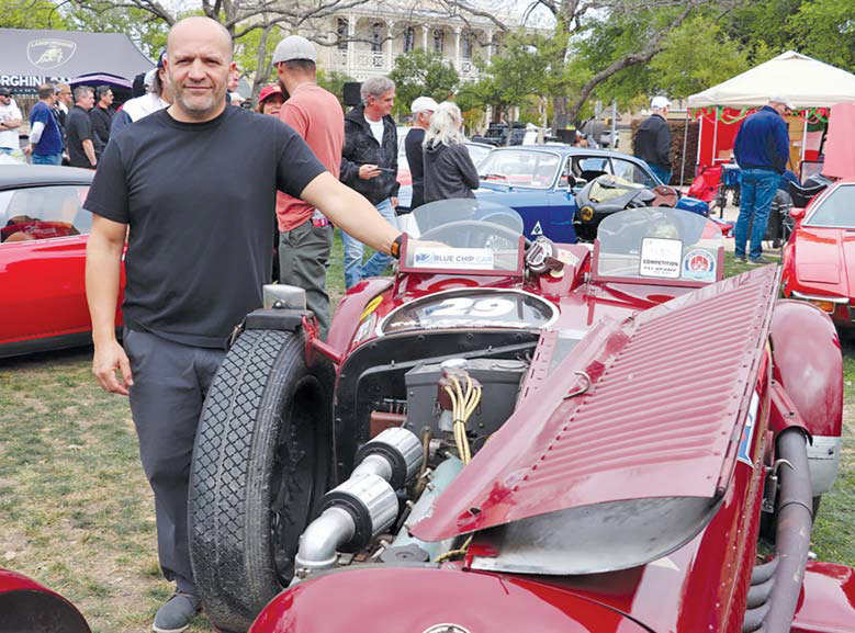 Antonio Brunet stands beside the 1934 Alfa Romeo 6C 2300 Siluro he has owned for the past five years. Brunet’s Alfa Romeo and Shane McMillian’s silver 2018 Lamborghini, reflecting the tree above, were part of the March 28 Italian Motor Gathering on Main Plaza.