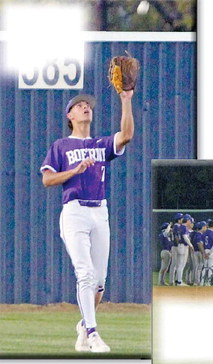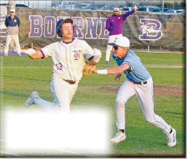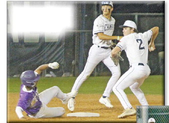 Champion first baseman Brody Bendele tags out Josh Kory on a play down the first base line during last week’s game as Charger coach Ben Woodchick (left) and Greyhound coach Geoff Curtin watch on the play. Champion second baseman (2) Owen Kuhl takes a toss from shortstop Garland Whitehead as Boerne High’s EJ Goolsby tries to beat the throw to prevent a double play.