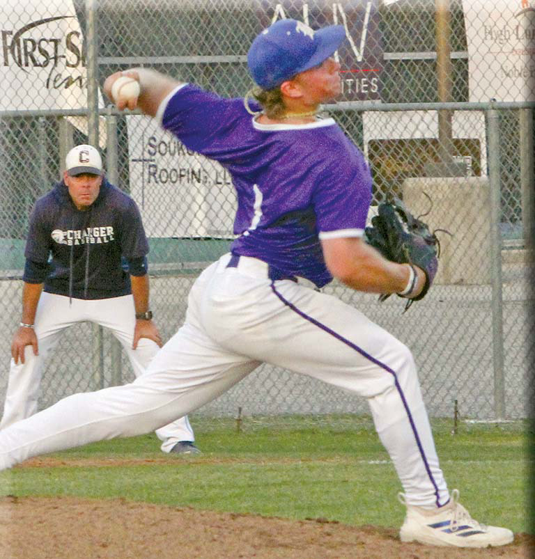 (LEFT) Boerne pitcher Jackson Grimes reaches way back on a throw as Chargers assistant John Uecker watches from the first-base coaching box.