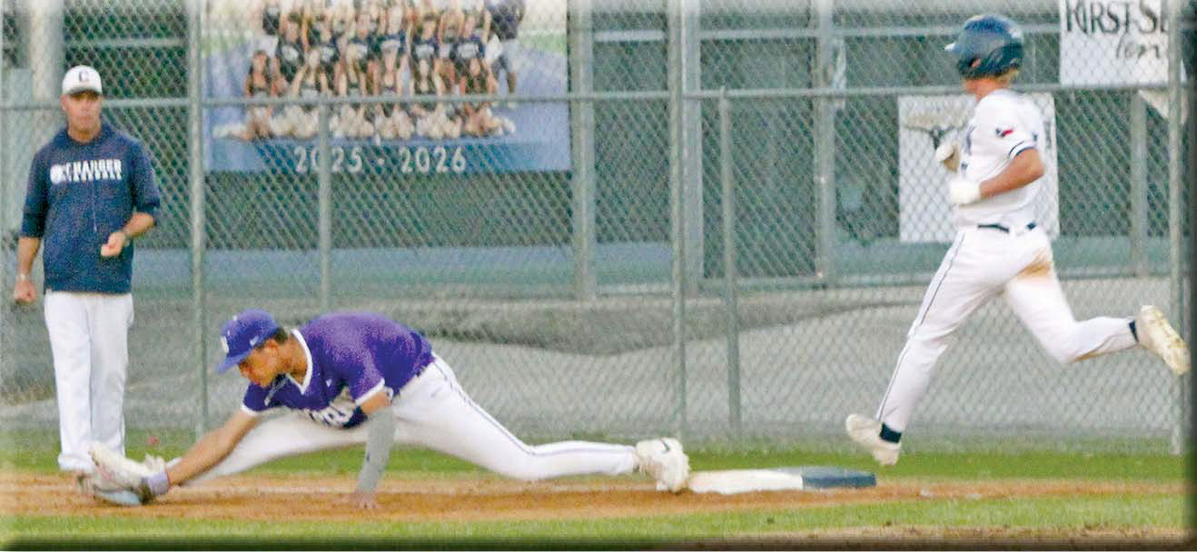 (BELOW) Boerne High first baseman Asher Wren does the splits as he reaches for a low throw to register an out on the bag.