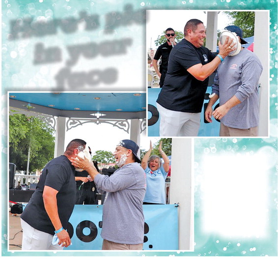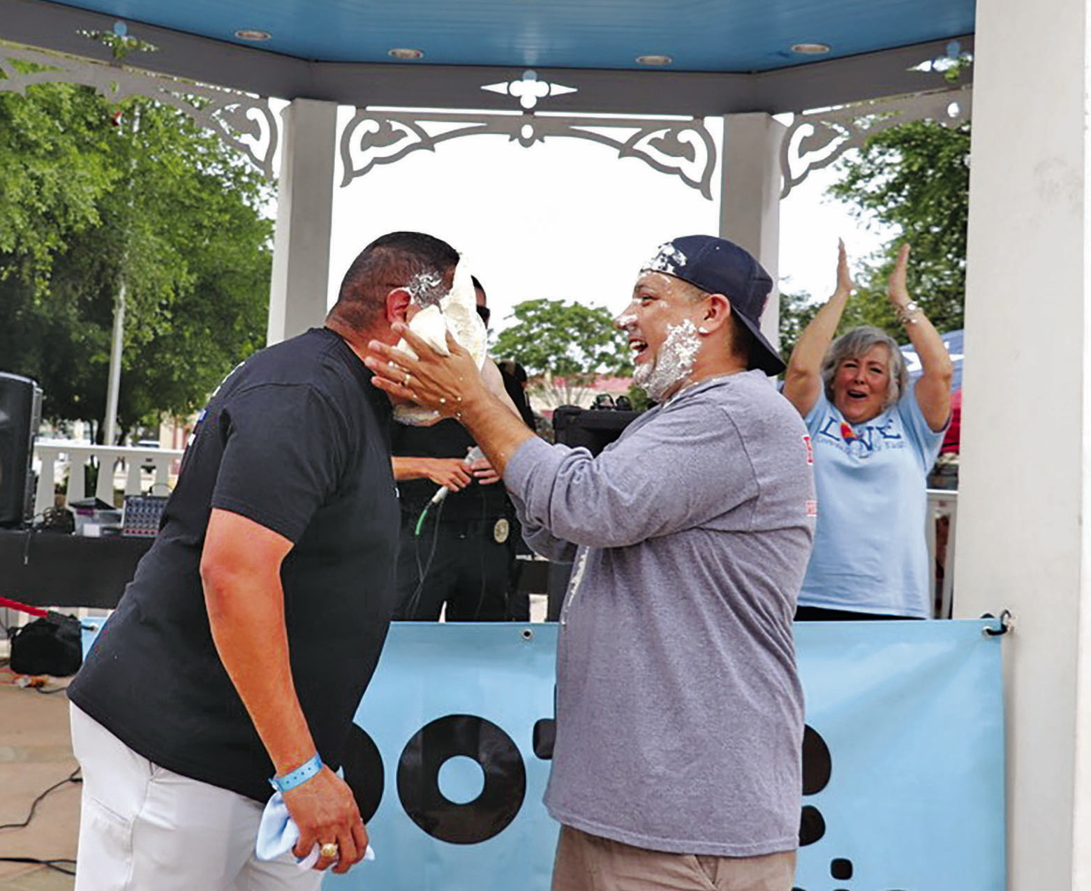 Boerne Police Chief Steve Perez, above, delivers a whipped cream pie to the face of Boerne Fire Chief Manny Casarez Saturday at Main Plaza during the conclusion of the “Battle of the Badges” fundraiser for LOVE Kendall County Kids. Votes were placed during a weeks-long campaign for either chief; the one amassing the most points, Casarez, got pied, with pies donated by Tootie Pie Co. In the interest of good sportsmanship, Perez took one to the face as well.